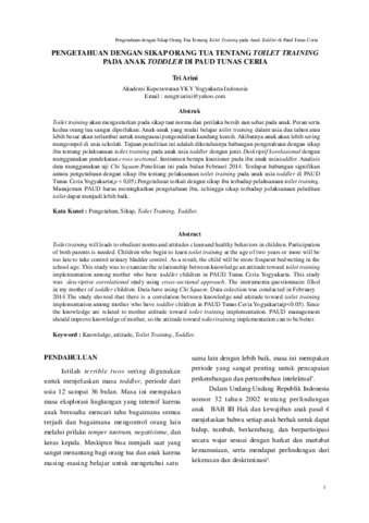 Arini, Tri (2016) PENGETAHUAN DENGAN SIKAP ORANG TUA TENTANG TOILET TRAINING PADA ANAK TODDLER DI PAUD TUNAS CERIA. Jurnal Keperawatan AKPER YKY, 4 (1). pp. 1-6. ISSN 2356-265X