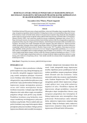 Nuryandari, NY and Wibawa, Zetty and Anggraini, Winarti (2016) HUBUNGAN ANTARA TINGKAT PENGETAHUAN MAHASISWA DENGAN KECEMASAN MAHASISWA MENGHADAPI PRAKTIK KLINIK KEPERAWATAN DI AKADEMI KEPERAWATAN YKY YOGYAKARTA. Jurnal Keperawatan AKPER YKY, 4 (1). pp. 27-31. ISSN 2356-265X