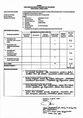 Okfia, Tri and Rachmawati, Nunung and Aristina, Tenang (2020) Peer Review A Documentation Study Of Self_Care Deficits in Patients With Schizophrenia at The Arjuna Guesthouse in Yogyakarta Grhasia Mental Hospital. Urbangreen Journal, 02 (01). pp. 12-18.