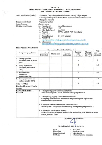 Harigustian, Yayang (2021) Peer Review Hubungan Tingkat Pengetahuan Mahasiswa Tentang Triage Dengan Keterampilan Triage Pada Praktik Klinik Keperawatan Gawat Darurat dan Manajemen Bencana. JURNAL KEPERAWATAN, 13 (01). pp. 24-32. ISSN 2356-265X