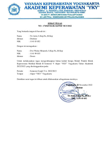 Penyusunan modul praktek klinik Keperawatan Medikal Bedah II Akademi Keperawatan “YKY” Yogyakarta Tahun Akademik 2022/2023 ini, didasarkan atas ketentuan bahwa; pendidikan profesi termasuk tenaga perawat diwajibkan memenuhi standar kompetensi yang dipersyarakatkan, untuk itu Akademi Keperawatan “YKY” menyusun modul praktek klinik Keperawatan Medikal Bedah II Akademi Keperawatan “YKY” Yogyakarta Tahun Akademik 2022/2023 untuk memenuhi kebutuhan tersebut. Modul praktek klinik Keperawatan Medikal Bedah II Akademi Keperawatan “YKY” Yogyakarta tahun akademik 2022/2023 ini disusun dengan tujuan agar tercapai pemahaman yang sama antara dosen dan mahasiswa tentang kompetensikompetensi yang harus dicapai oleh mahasiswa dalam pelaksanaan bimbingan praktek klinik, tindakan serta evaluasi sesuai dengan standar kompetensi yang dipersyaratkan. Untuk itu semua dosen tim mata kuliah dan mahasiswa Akademi Keperawatan “YKY” wajib memahami modul praktek klinik Keperawatan Medikal Bedah II ini, dengan harapan pelaksanaan bimbingan praktek klinik, tindakan serta evaluasi dapat berjalan dengan baik. Kami mengucapkan terima kasih yang sebesar-besarnya kepada tim penyusun yang telah berupaya dengan sungguh-sungguh sehingga dapat tersusun modul ini, dan juga kepada semua pihak yang telah membantu dalam proses penyusunan modul ini. Modul ini perlu terus dilakukan penyempurnaan untuk memenuhi kebutuhan sesuai perkembangan IPTEK keperawatan/kesehatan yang terus berkembang dengan cara dilakukan evaluasi secara periodik / tahun.