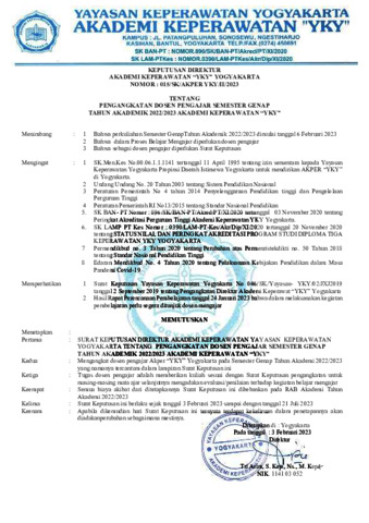 Harigustian, Yayang and Arini, Tri and Aristina, Tenang and Amalia, Rahmita Nuril and Rachmawati, Nunung and Minarsih, Dwi Wulan and Juwartini, Dwi and Murtoyo, Eddy and Kusumanintyas, Dewi and Diana, Venny DOKUMEN SK MENGAJAR GENAP 2022 / 2023. Akademi Keperawatan YKY Yogyakarta.