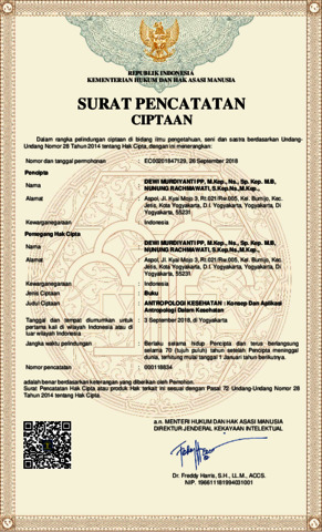 Prihatin Putri, Dewi Murdiyanti and Rachmawati, Nunung (2018) Sertifikat HAKI Buku Antropologi Kesehatan : Konsep dan Aplikasi Antropologi Dalam Kesehatan. Sertifikat HAKI Buku Antropologi Kesehatan : Konsep dan Aplikasi Antropologi Dalam Kesehatan.
