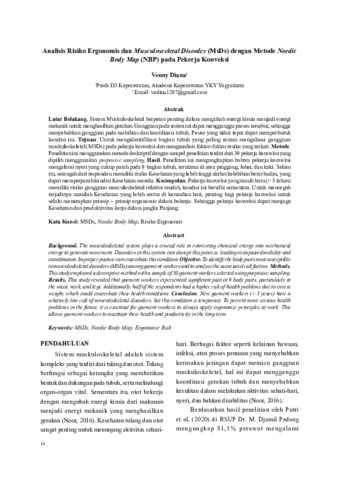 Diana, Venny Analisis Risiko Ergonomis dan Musculosceletal Disorder (MsDs)_Venny Diana. JURNAL KEPERAWATAN, 16 (1). pp. 14-20. ISSN 2356-265X